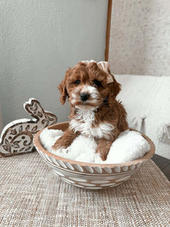 More about him: We haven't gotten to name him yet as we are waiting for him to be ready to go home (We typically leave the naming up to the guardian family). We have purchased this loving boy from outside lines in hopes he will join our program and be the daddy to a few litters in the coming years. He will mature around 15 pounds so he is a tiny guy. He is a total lover and has such a human like personality. He is polite and well mannered, his gentle nature is hard to look past. He has some spunk when it is playtime and loves to take treats. His coat is super soft and he will be a beautiful wavy coated petite goldendoodle. We expect him to mature 12-18 pounds as an adult.